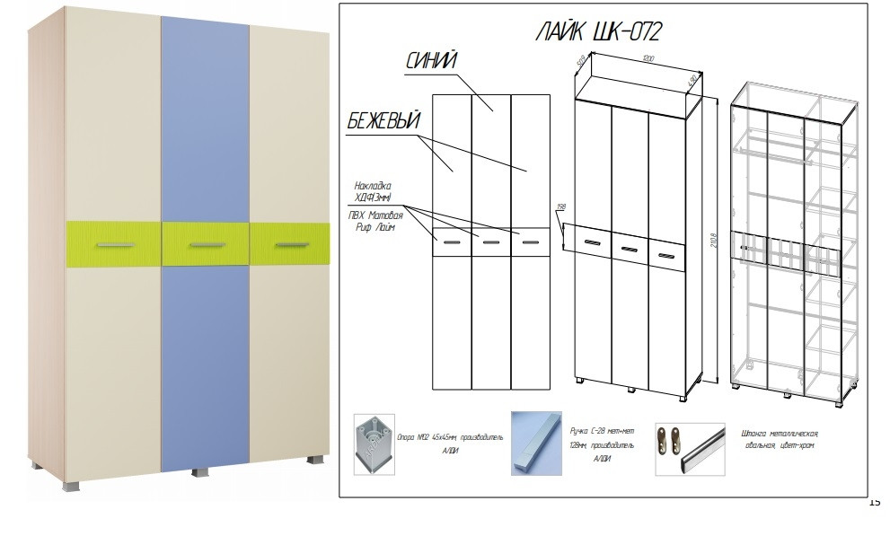 - Шкаф трёхстворчатый состоит из секции с полками (шириной 1/3 шкафа) и секцией с полкой и 2мя штангами (шириной 2/3 шкафа), данные секции универсальные, могут располагаться с любой стороны, для этого необходимо выбрать расположение отверстий под перегородку на верхней и нижней крышке.