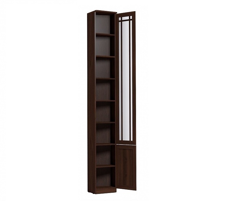 Высокий шкаф с полками и комбинированным фасадом станет незаменимым элементом в гостиной, библиотеке или рабочем кабинете. Модель скошенная, и глубина зауженной частисоставляет всего 17 см! Наполнение шкафа - регулируемыеполки, которые Вы можете установить на удобной для Вас высоте. Максимальная нагрузка на одну полку - 13 кг. Тонированное стекло на фасаде защитит все Ваши книги и предметы декора от вредного воздействия солнечных лучей. Для максимальной безопасности модуль крепится к стене за подвесы, с другими шкафами скрепляется межсекционной стяжкой. Особенности ЛДСП 16 мм, профиль МДФ, кромка ПВХ тонированное стекло 4 мм декор "орех" комплект регулируемых по высоте полок обязательное крепление к стене за подвесы правый скос
