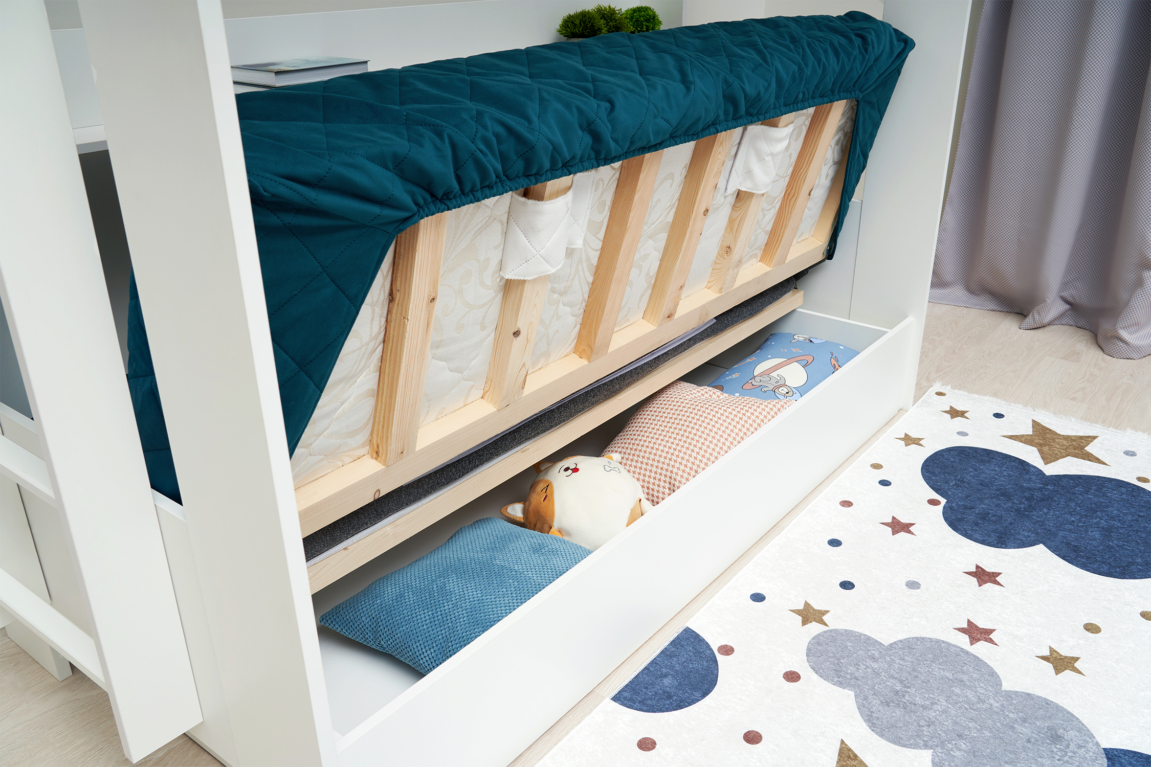 Механизм трансформации дивана: «Книжка». Рекомендуемая высота матраса на верхний ярус 17 см. Максимальная нагрузка на верхний ярус 50 кг. Лестница может быть установлена с обеих сторон кровати. Высота бортика 30 см. Максимальная нагрузка на нижний ярус 90 кг. Чехол съемный.