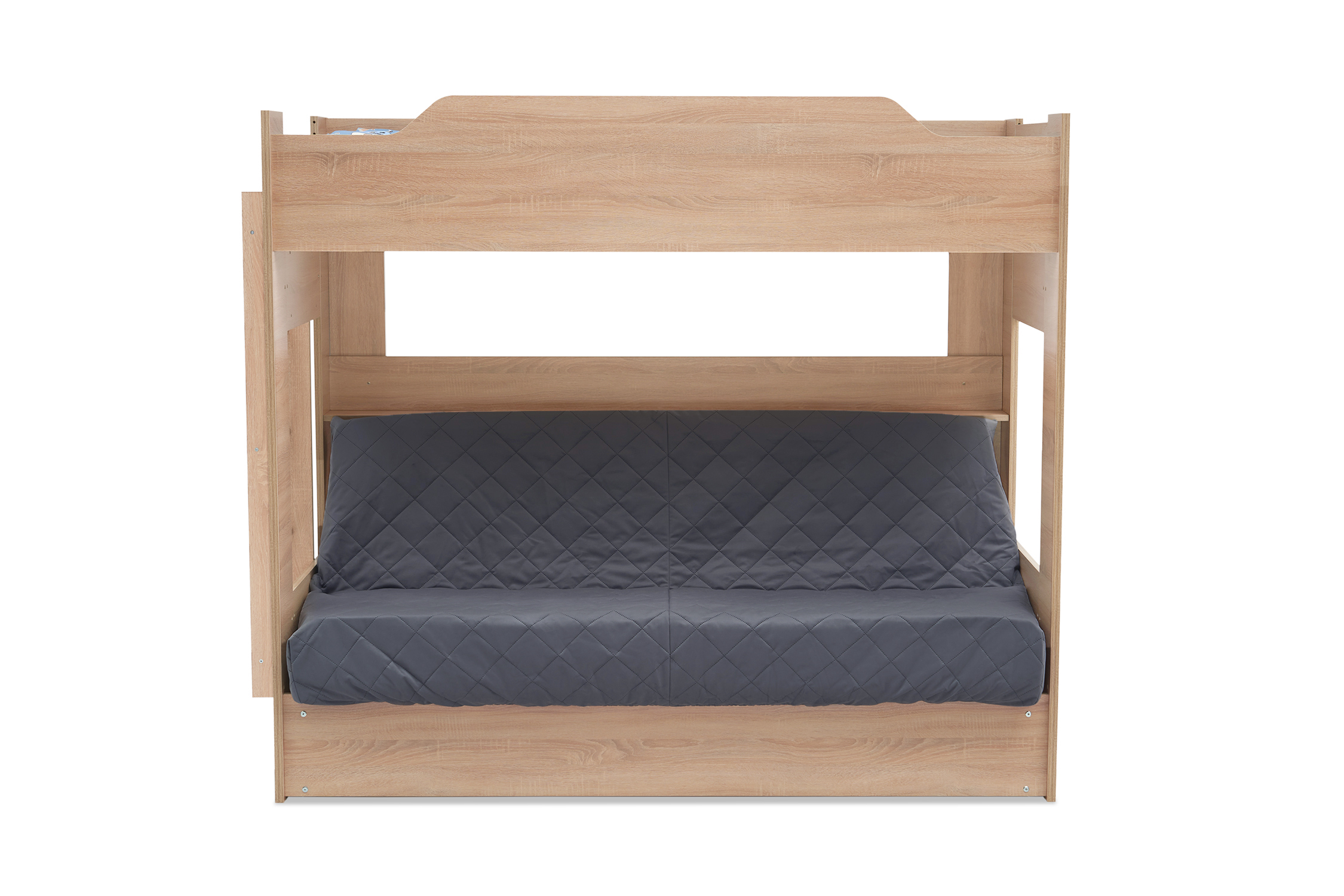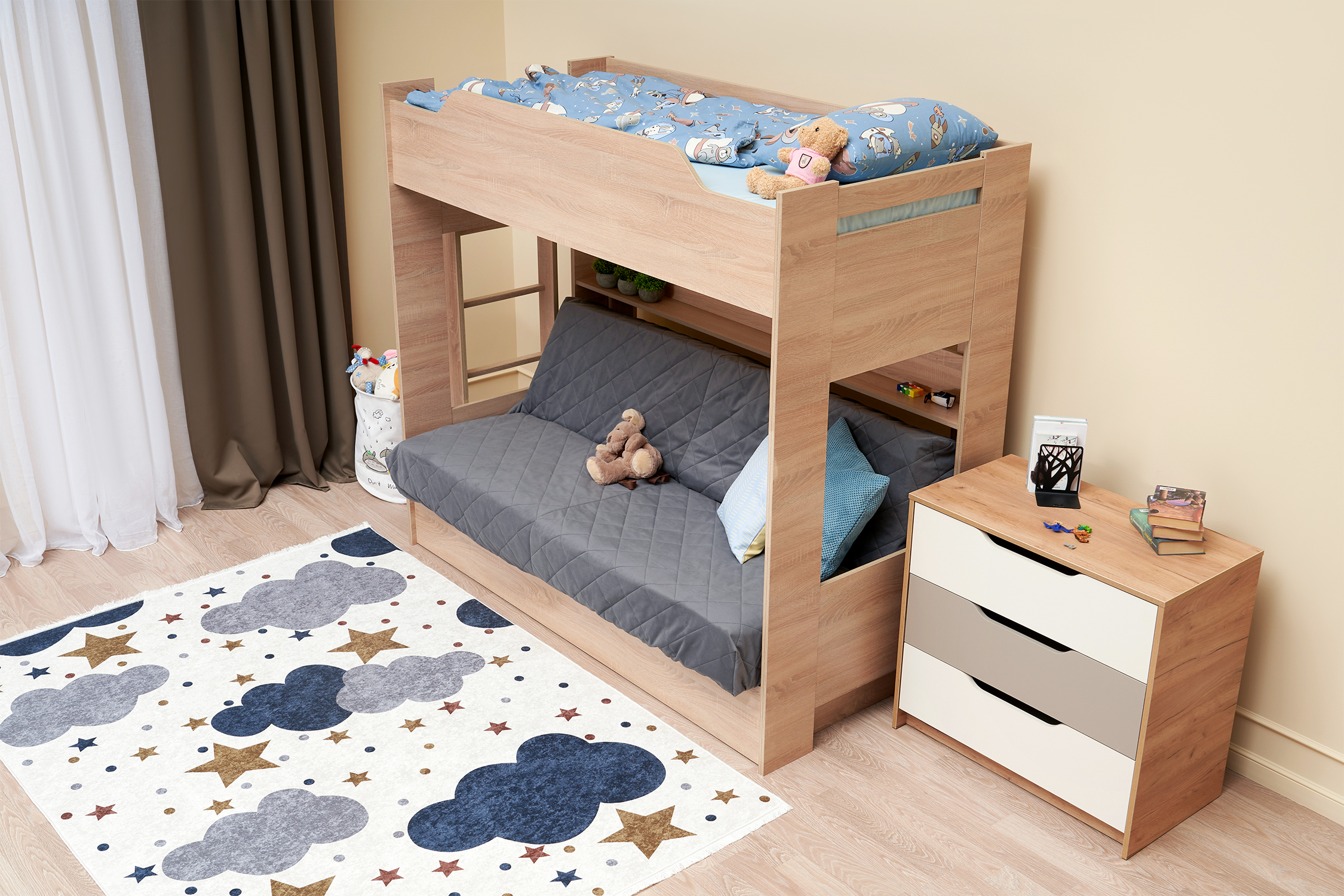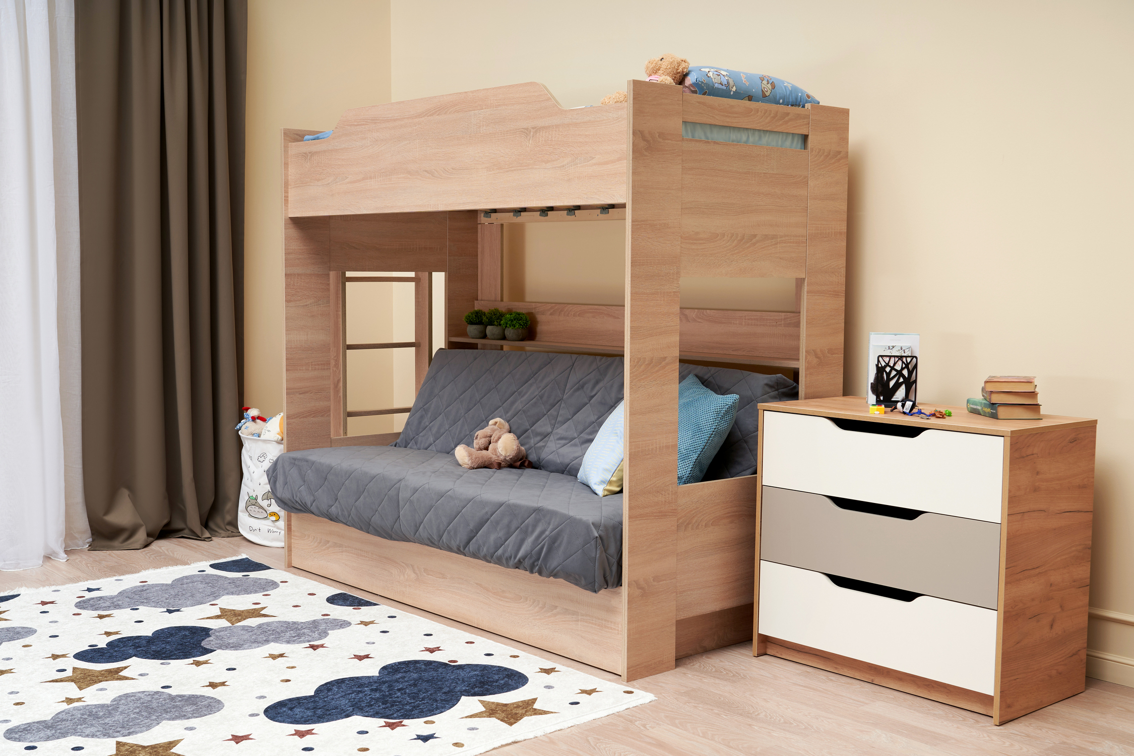Механизм трансформации дивана: «Книжка». Рекомендуемая высота матраса на верхний ярус 17 см. Максимальная нагрузка на верхний ярус 50 кг. Лестница может быть установлена с обеих сторон кровати. Высота бортика 30 см. Максимальная нагрузка на нижний ярус 90 кг. Чехол съемный. |